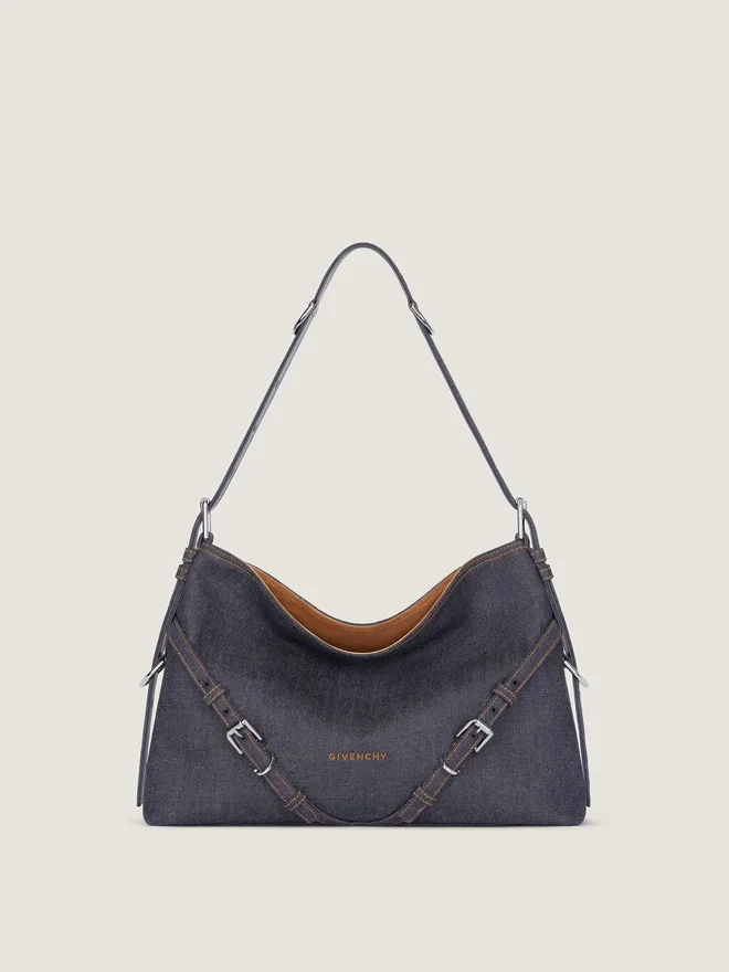 Borsa a tracolla media in denim con cuciture a contrasto.Linea Voyou.Silhouette morbida a forma di V e volume generoso.Tracolla regolabile che consente di portare la borsa a mano, a spalla o a tracolla.Firma Givenchy ricamata sulla parte anteriore della borsa. Delicate fibbie in metallo con incisione Givenchy. Dettagli in metallo con finitura argentata. Un scomparto principale e una tasca interna con cerniera. Fodera in pelle scamosciata.Color:Blu indacoComposizione:100% cotone. Fodera: 100% pelle di vitello.Dimensioni:38 cm x 31 cm x 10 cmLunghezza tracolla:Min: 25 cm • Max: 55 cm 18 cm x 13,5 cm x 3,5 cm Portacarte Sì Custodia per occhiali – Ombrello tascabile – Iphone 13 Sì Libro tascabile – Ipad Pro – Mac Book Air -Cosa ci sta nella tua Voyou Bag? Dimensioni: 29,5 cm x 11 cm x 16,5 cm</Portacarte Sì Custodia per occhiali Sì Ombrello tascabile Sì iPhone 13 Sì Libro tascabile Sì iPad Pro – MacBook Air -Cosa ci sta nella tua Voyou Bag media? Dimensioni: 39,6 cm x 38,1 cm x 9,9 cm Portacarte Sì Custodia per occhiali Sì Ombrello tascabile Sì iPhone 13 Sì Taccuino Sì iPad Pro Sì MacBook Air SìCosa ci sta nella tua Voyou Bag Large? Dimensioni: 48,1 cm x 38,1 cm x 9,9 cm