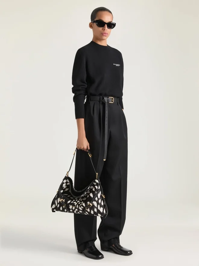 Borsa a tracolla media in pelle di vitello effetto pony con motivo leopardo delle nevi.Linea Voyou.Silhouette morbida a V e volume generoso.Tracolla regolabile che consente di portarla a mano, a tracolla o a spalla.• Firma Givenchy in metallo sul davanti della borsa e impressa sulla parte superiore della tracolla. • Toppe Givenchy Paris all’interno. • Fibbie in metallo con incisione Givenchy. • Dettagli in metallo con finitura dorata.• Uno scomparto principale e una tasca interna con cerniera. • Fodera in pelle scamosciata. • Ogni borsa è unica e la stampa può variare da un modello all’altro. DimensioniD 15 pollici x 12,2 pollici x 3,9 polliciD Lunghezza del cinturinoD Min: 9.8 In