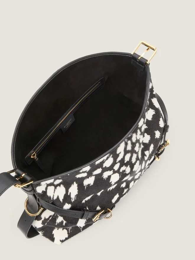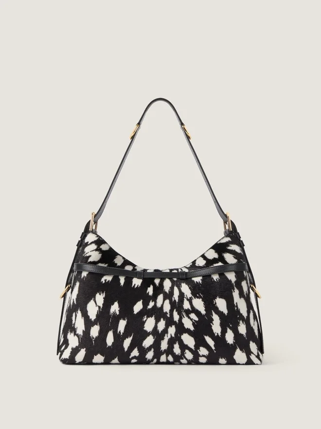 Voyou Shoulder Bag in pelle di vitello effetto pony con motivo leopardo delle nevi. Linea Voyou. Silhouette morbida a V e