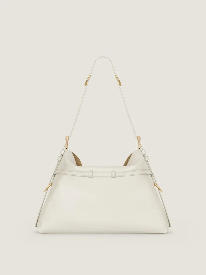 Borsa a tracolla media in pregiata pelle di vitello liscia e lucida.Linea Voyou.Silhouette morbida a V e volume generoso.Tracolla regolabile che consente di portare la borsa a mano, a spalla o a tracolla.Firma Givenchy impressa sulla parte anteriore della borsa e sulla parte superiore della tracolla. Delicate fibbie in metallo con incisione Givenchy. Dettagli in metallo con finitura dorata.Un scomparto principale e una tasca interna con cerniera. Fodera in pelle scamosciata. ColoreAvorioDimensioniMediaComposizione100% pelle di vitello.DimensioniD 15 pollici x 12,2 pollici x 3,9 polliciD Lunghezza della tracollaD Min: 9.8 In