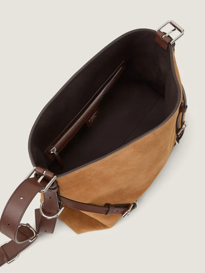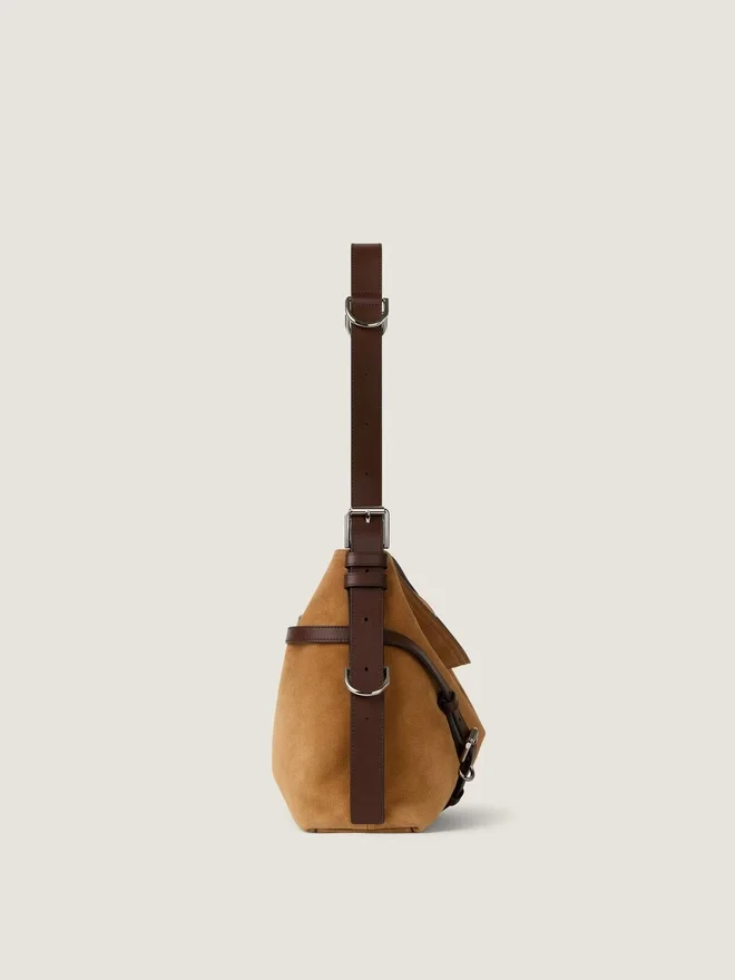 Voyou Shoulder Bag in pelle di vitello scamosciata con dettagli in pelle a contrasto. Linea Voyou. Silhouette morbida a forma di V e