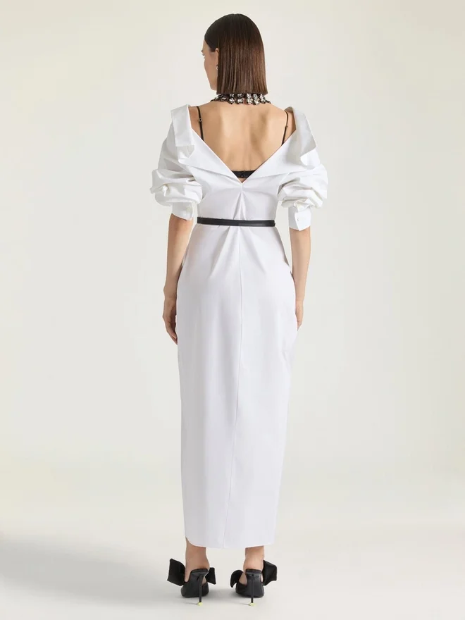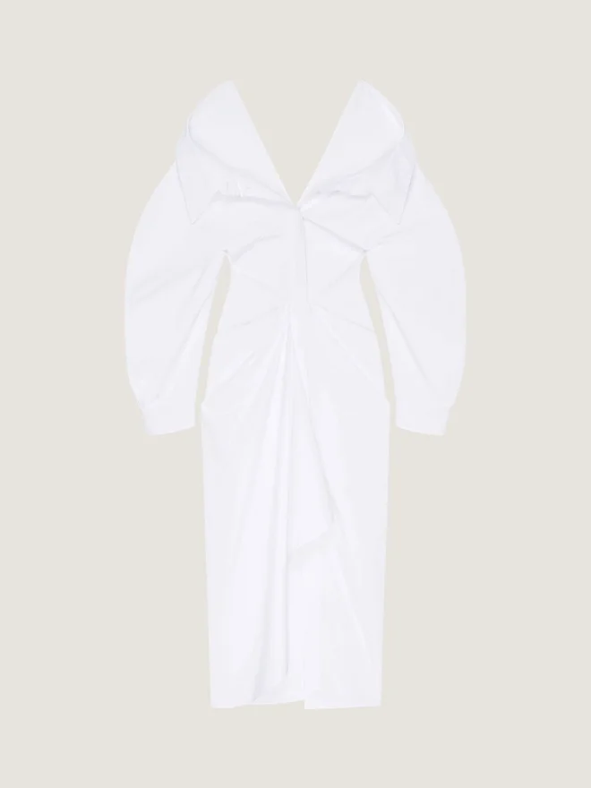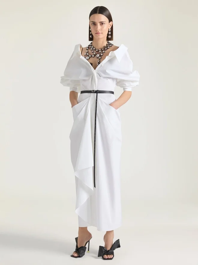 Una silhouette ispirata al gesto di drappeggiare una giacca di pelle su un manichino. I tessuti sono attorcigliati e avvolti intorno al corpo con sensualità, mentre gli spacchi sul davanti e le tasche creano movimento e carattere. Abito camicia lungo con maniche lunghe in popeline di cotone. Spacco sul retro.• Drappeggiato sul davanti. • Chiusura con bottoni nascosti sul davanti. • Due tasche anteriori. • La modella è alta 1,77 m e indossa una taglia 36. D ColoreD BiancoD ComposizioneD 100% cotoneD CuraNon lavareStirare alla massima temperatura della piastra (110 °C) senza vaporeNon asciugare in asciugatriceNon candeggiareLavaggio a secco professionale, con tetracloroetilene e idrocarburi, trattamento molto delicatoPrezzo: 1.000,00 €Paese di origine: ItaliaCodice prodotto: Bw22T71642-100 Informazioni sulla cura: i nostri laboratori progettano con audacia e creatività capi unici, realizzati con materiali di alta qualità.Per preservare la brillantezza del tuo prodotto Givenchy, ti consigliamo di riporlo in una custodia in cotone e in un luogo fresco e asciutto. Per la maggior parte dei nostri prodotti è consigliato il lavaggio a secco. Assicurati di seguire le istruzioni di cura riportate sull’etichetta del tuo capo. Non esitare a visitare la nostra pagina dedicata o a contattare direttamente i nostri team Givenchy se desideri ulteriori informazioni.Non lavareStirare alla massima temperatura della piastra (110 °C) senza vaporeNon asciugare in asciugatriceNon candeggiareLavaggio a secco professionale, con tetracloroetilene e idrocarburi, trattamento molto delicato