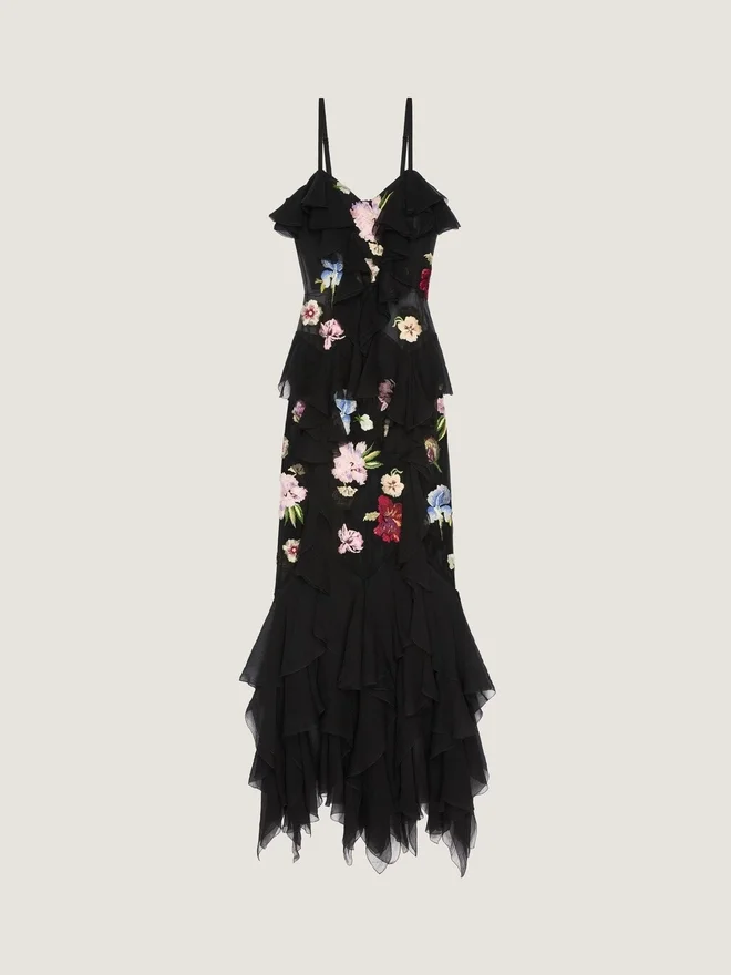 Abito con volant in chiffon di seta con ricami