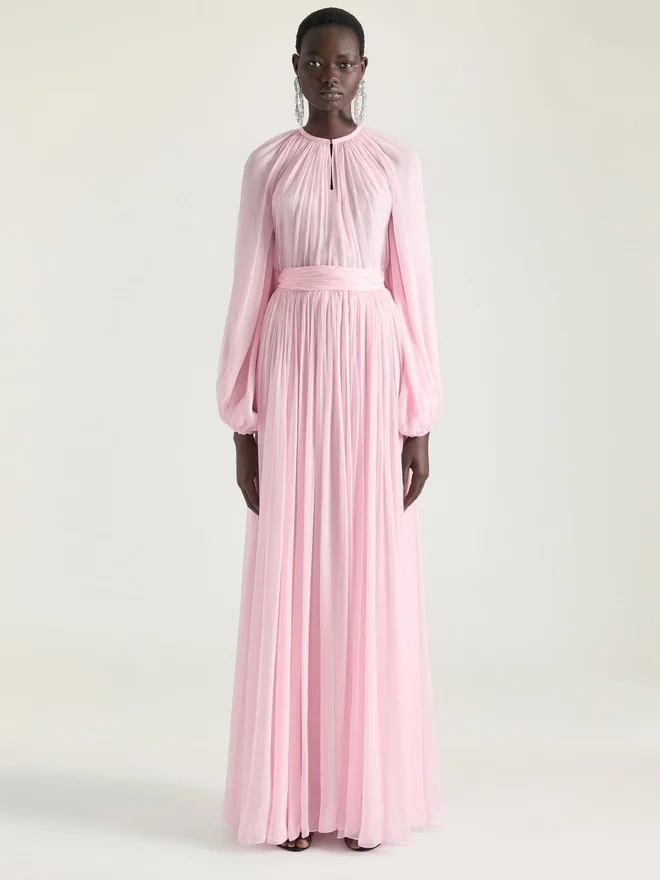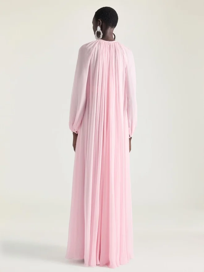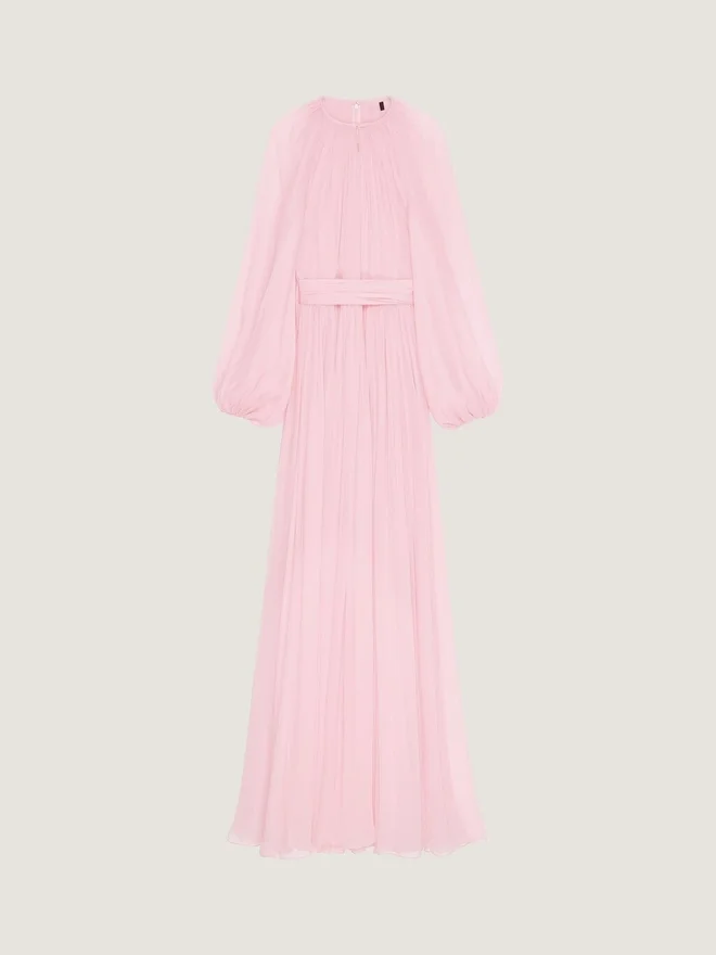 Abito da sera lungo con maniche a palloncino in chiffon di seta. Girocollo. Piccolo spacco sullo scollo. Chiusura con cerniera invisibile sul retro.