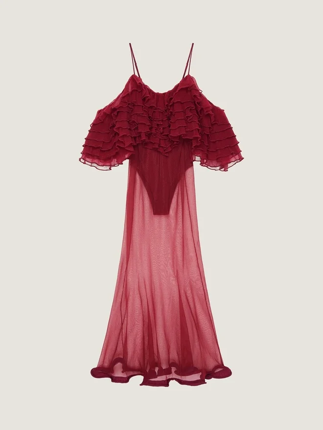 Abito lungo in maglia ultra-fine trasparente. Volant nella parte superiore. Spalline sottili regolabili. Body integrato con chiusura a bottoni a pressione