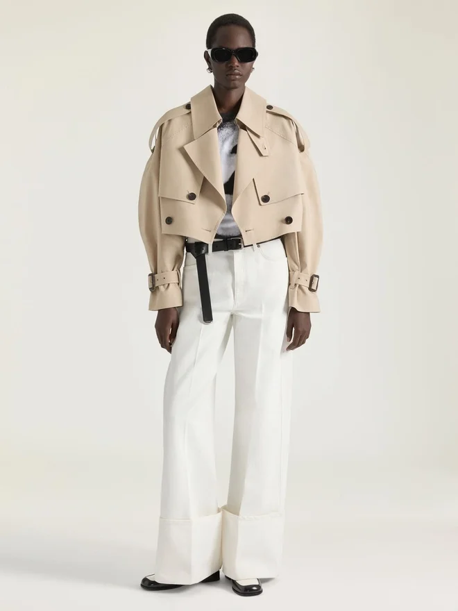 Trench in cotone. Colletto con revers. Linguette di regolazione sui polsini e sulle spalle. Fodera a contrasto. Cropped Fit. La modella è alta 1,77 m e indossa una taglia 36.