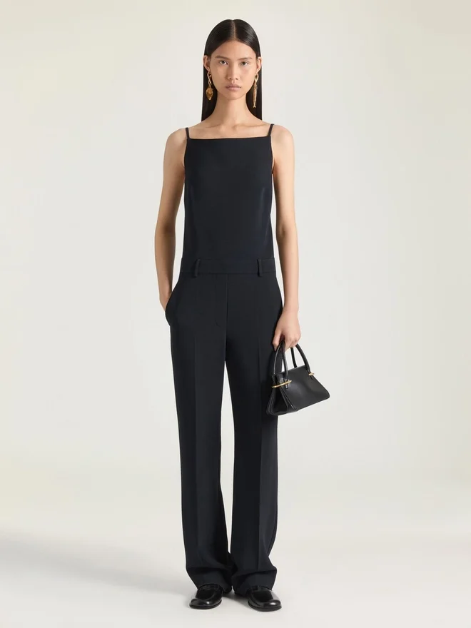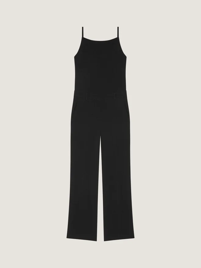 Tuta intera con taglio a fessura in crêpe cady. Scollo quadrato. Chiusura con zip sul retro. Due tasche laterali. Una tasca posteriore. Misure della modella