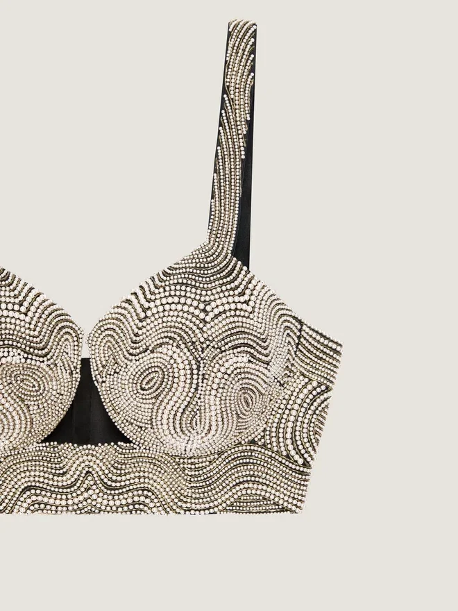 Top a reggiseno in raso con perle ricamate