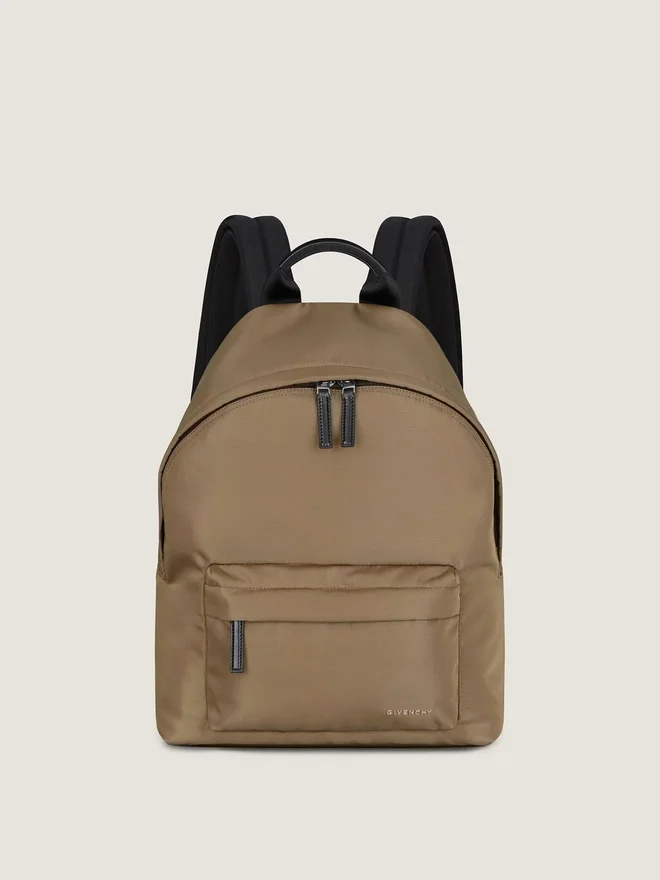 Zaino in tela. Linea Essential U. Chiusura con cerniera e doppio tirante in pelle. Firma Givenchy in metallo sul davanti.